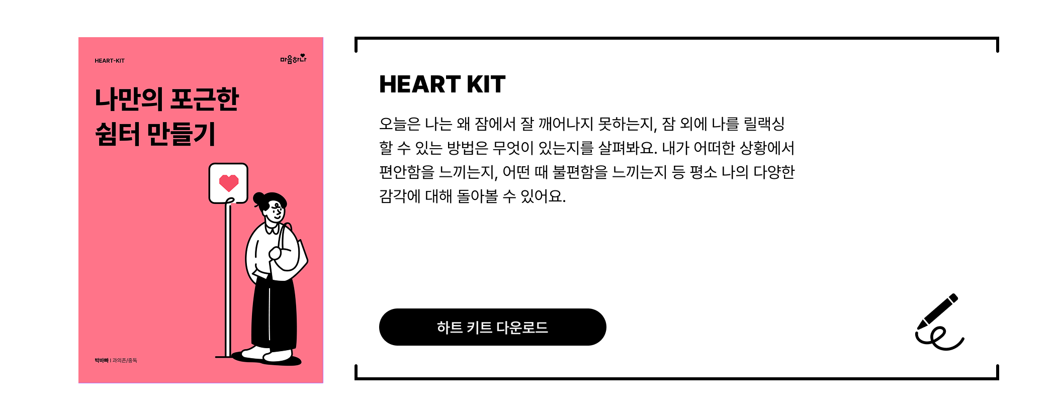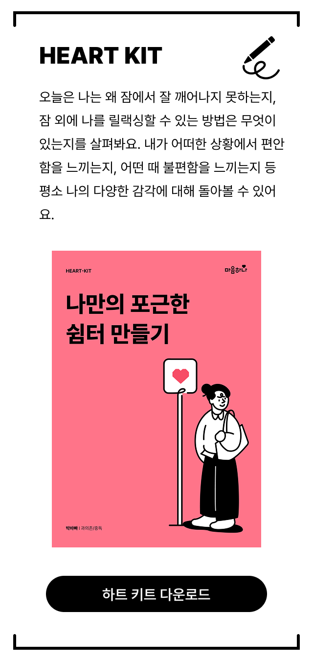 마지막으로, 잠들기 전 분위기를 살짝 바꾸는 것만으로도 몸과 마음에게 “이제 휴식할 시간이야”라는 신호를 줄 수 있어요. 오늘 밤, 나만의 잠자리 분위기를 다르게 만들어보고 싶다면 아래 ‘하트키트(HEART-KIT)’를 열어보세요. 이번 하트키트는 오늘 시작한 이 작은 변화가 조금씩 내 일상에 스며들 수 있도록 도와줄 거예요.