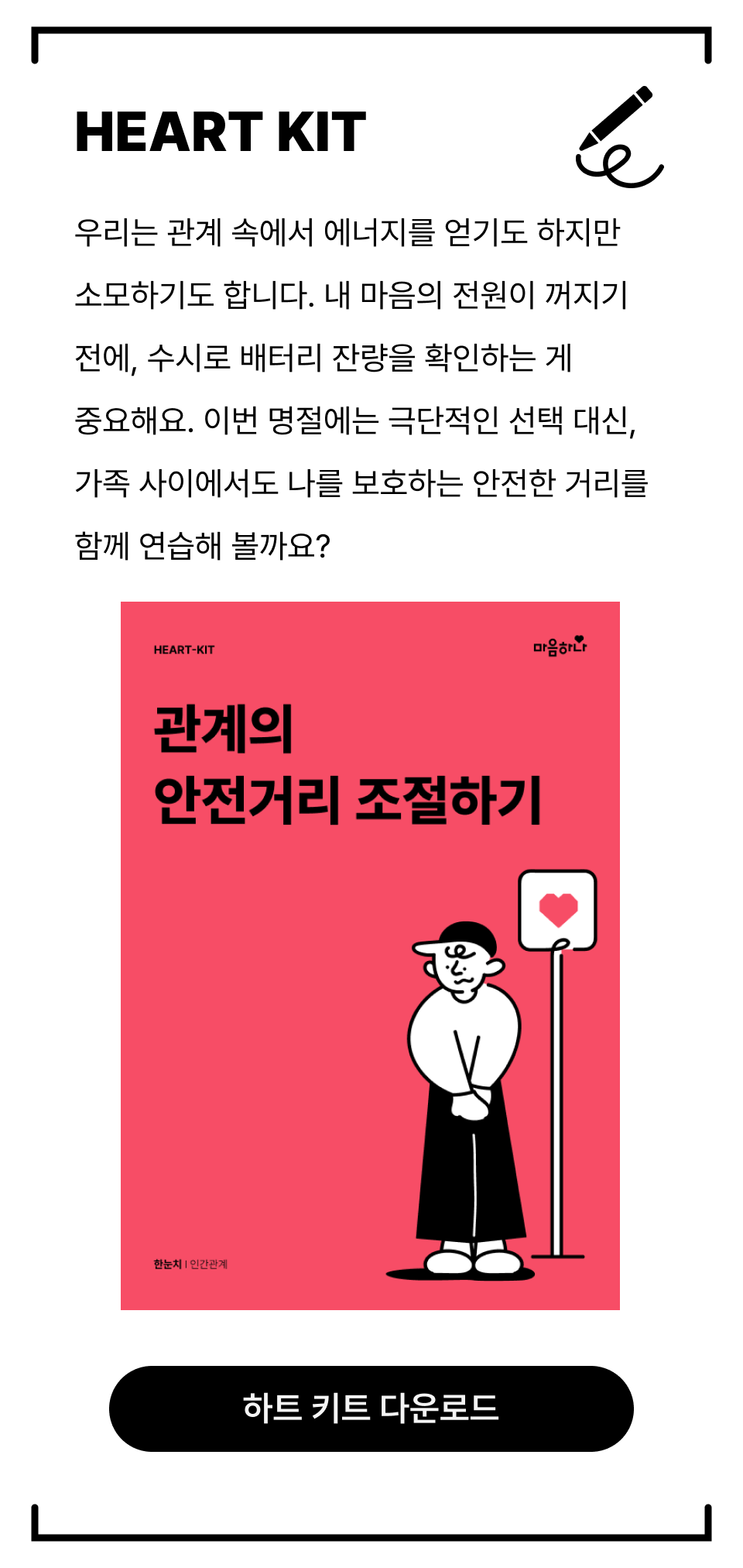 우리는 관계를 통해 에너지를 얻기도 하지만, 때로는 소모하기도 합니다.  이때, 내 마음의 배터리가 바닥나기 전에 수시로 잔량을 확인하는 게 중요해요.  마음의 전원이 꺼진 뒤에는 관계를 되돌리기가 무척 어렵거든요.  그러니 아예 가족들과 등을 돌리기 전에, 잠시 거리를 두고 나를 먼저 돌봐주세요.  내가 편안해져야 관계 속에서도 진정한 만족감을 느낄 수 있습니다. 오늘 배운 내용을 혼자서도 연습할 수 있도록‘하트키트(HEART-KIT)’를 준비했어요.키트를 통해 나를 지키는 연습을 시작할 여러분의 변화를 응원합니다.